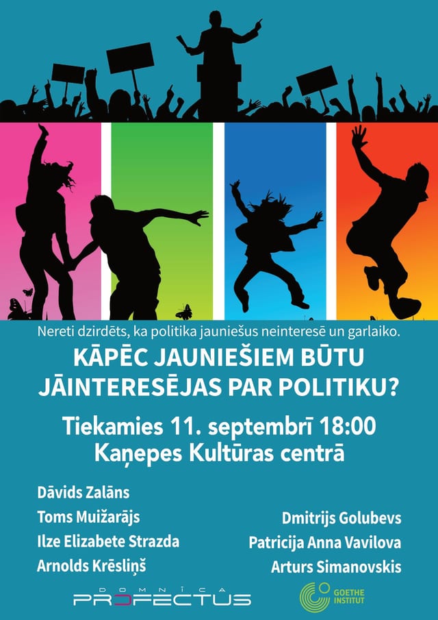 Nereti dzirdēts, ka politika jauniešus neinteresē un garlaiko. Vai tā tiešām ir? Vai to var mainīt? Kāpēc jauniešiem būtu jāinteresējas par politiku savā valstī? Varbūt tomēr labāk dzīvot neko nezinot? To visu mēģināsim noskaidrot Kaņepes kultūras centrā, 11.septembrī plkst 18.00.